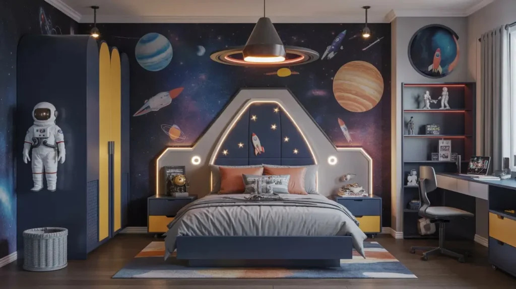 For furniture, think sleek and modern. White or metallic silver pieces work amazingly well here. I’ve seen people transform basic IKEA beds into rocket ships with some creative DIY paneling, and the results are mind-blowing. Add some LED strip lights in blue or purple underneath the bed frame, and boom—you’ve got a floating spacecraft.