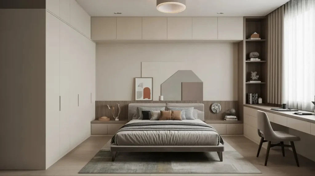 Keep furniture simple and functional. A platform bed with built-in storage, a streamlined desk, and closed storage cabinets that hide the chaos. The goal isn’t to make the room feel cold or empty, but rather calm and organized.