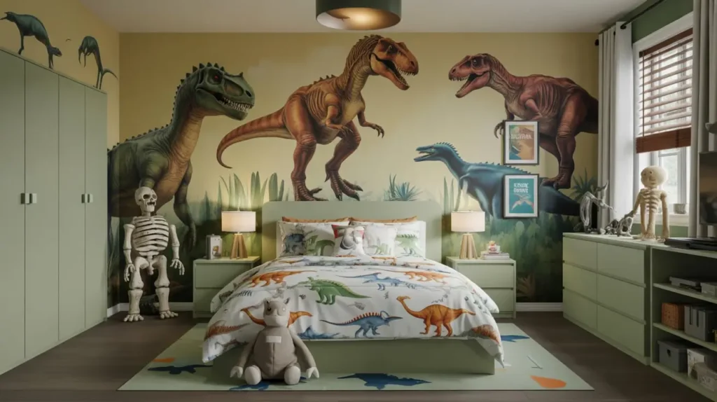 Dinosaurs are basically a childhood rite of passage. Every kid goes through a phase where they can pronounce “Pachycephalosaurus” better than they can spell their own name. A dinosaur room embraces that fascination and creates an educational play environment.