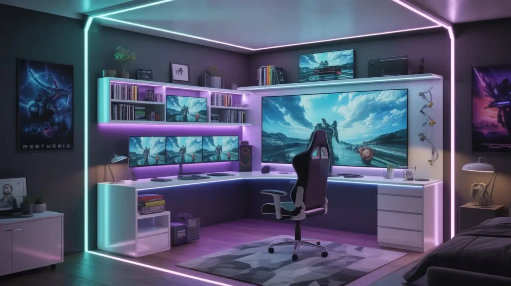 Go with a modern, sleek aesthetic. Black, white, neon accents—think cyberpunk vibes or futuristic gaming lounge. LED strip lights are your best friend here. Line them under shelves, behind monitors, around the bed frame. Many come with remotes or apps that let you change colors and even sync with music.