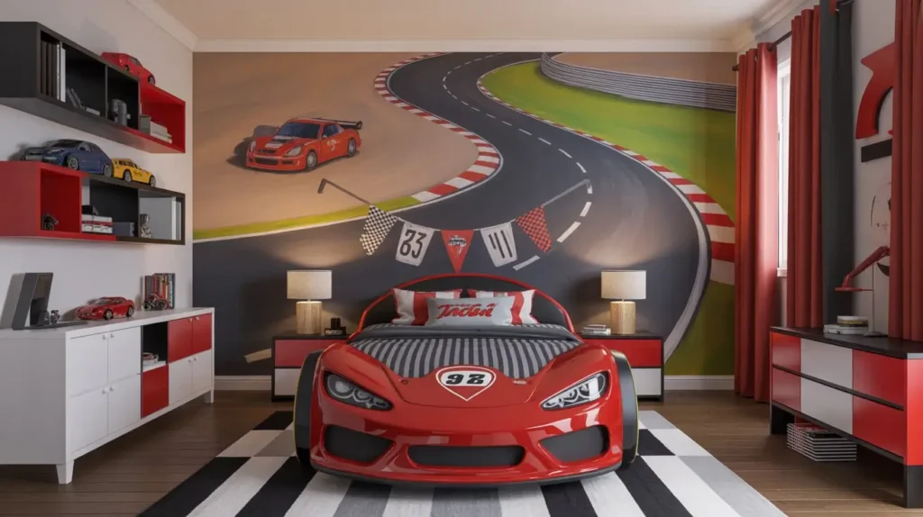 Transform the room into a mechanic’s garage. Industrial elements work great here—think checkered flags, tire tracks, road signs, and actual automotive parts as decor. The garage approach feels more grown-up while still celebrating their love of speed.