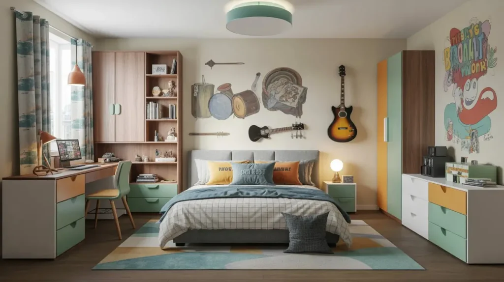The beauty of this theme? It constantly evolves. As he creates new art, it goes on the walls. As his musical tastes change, the decor shifts with it. The room becomes a living portfolio of his growth and interests.