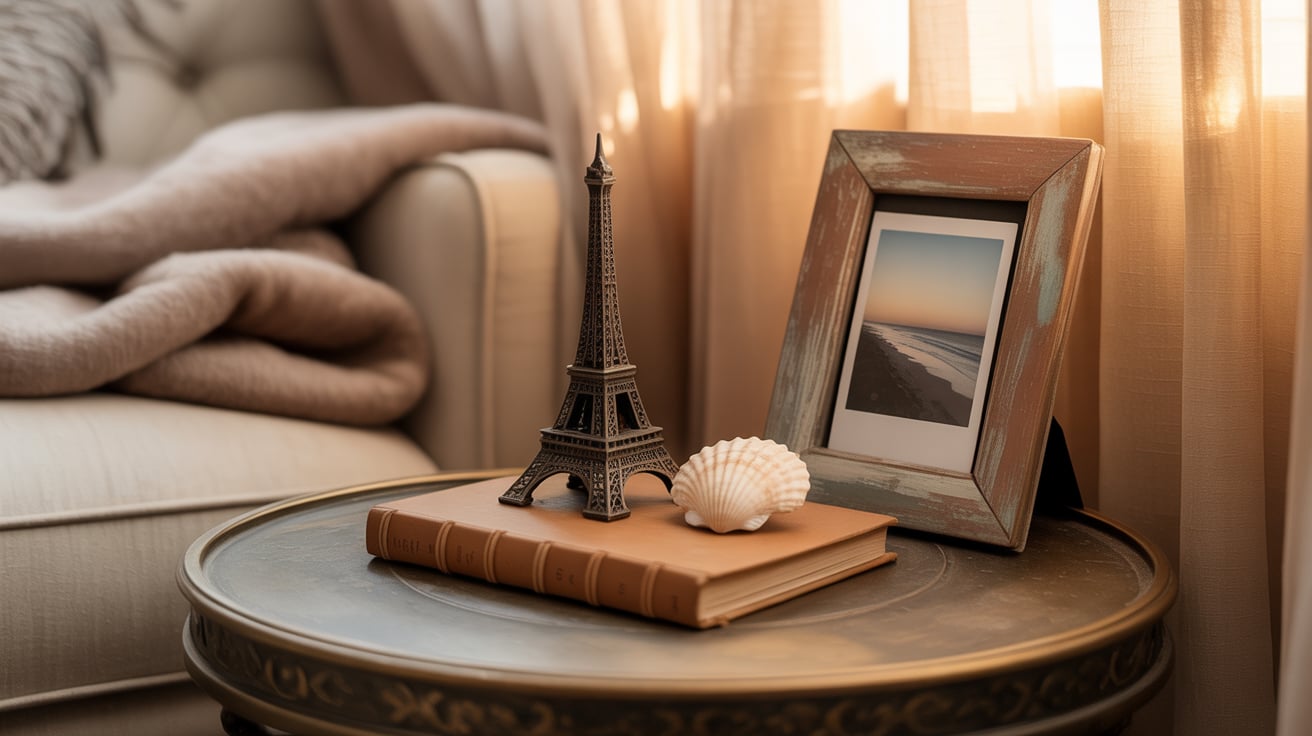 One of my favorite coffee table setups includes travel souvenirs — a shell from Greece, a tiny Eiffel Tower, and a book I picked up in Bali. Every item has a memory, and together, they tell my story.