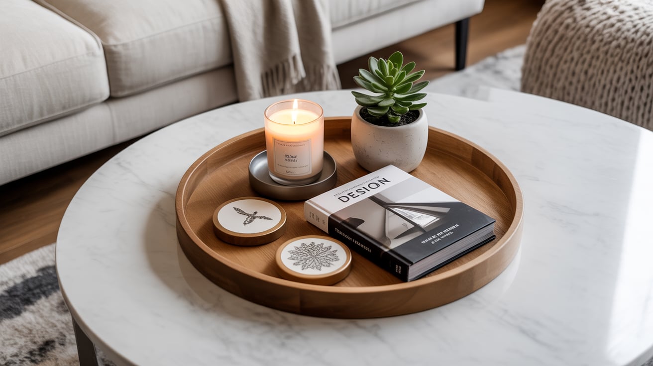 - Add 3–4 items: a candle, coasters, small plant, and decor book.