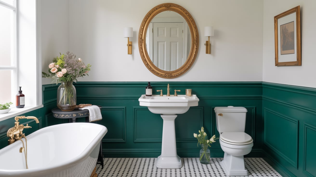 Wainscoting works because it adds structure and character. Painting it deep green grounds the room while keeping the top portion airy and bright.