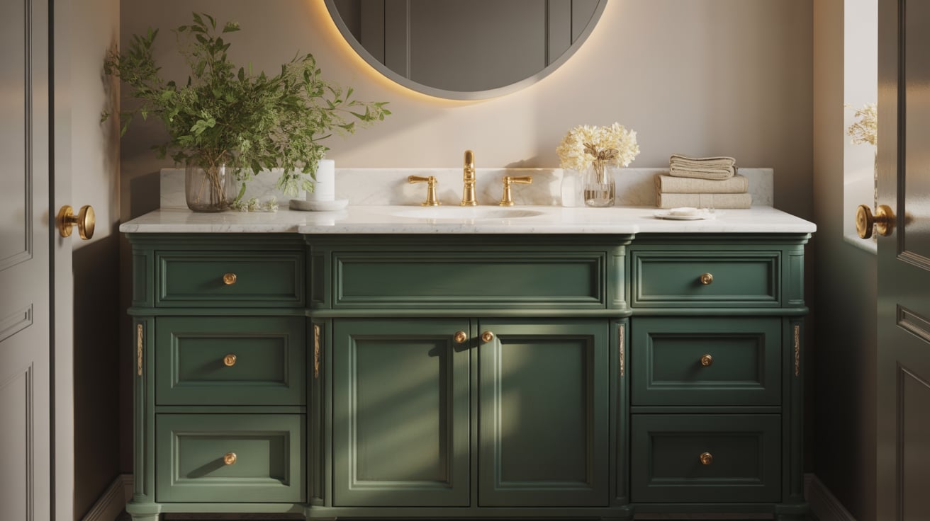 This idea works because it introduces bold color in a controlled way. A deep green vanity becomes the room’s centerpiece, balancing beautifully with marble, white tile, or natural wood. It’s a perfect DIY option for renters or anyone who loves a quick makeover.