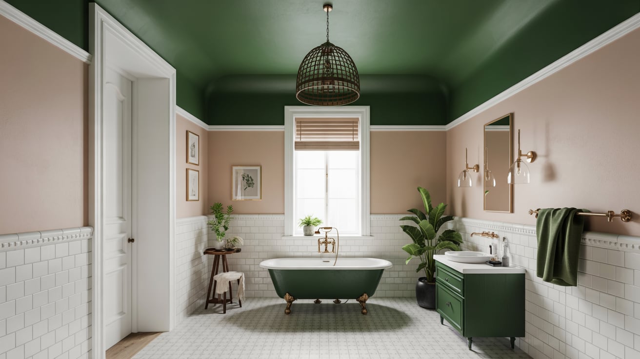 This technique works beautifully in light-colored bathrooms. The green ceiling draws the eye upward, adding unexpected drama without darkening the whole space.