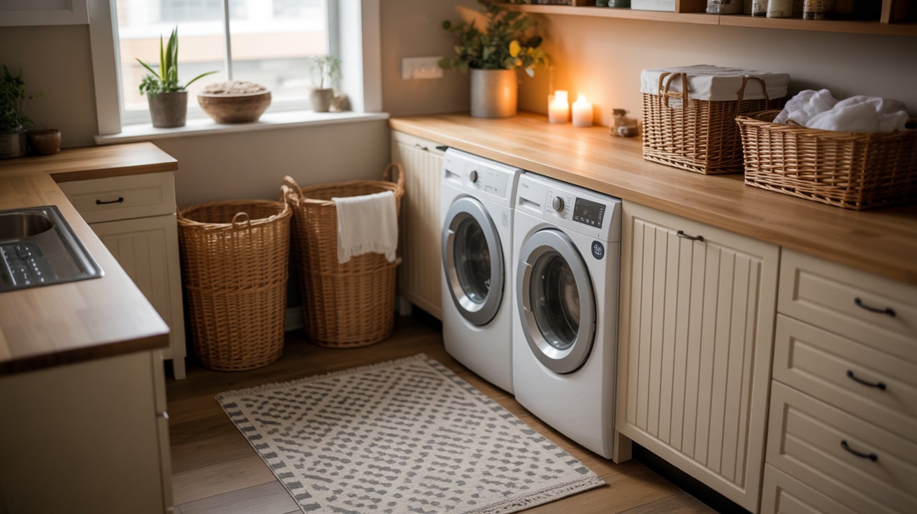 Once I added a small rug, a candle, and a woven basket for fresh linens, my laundry room stopped feeling like a chore zone — it became my calm little retreat.