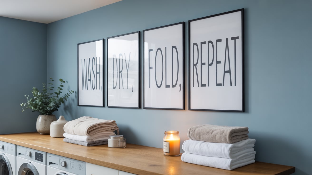 I hung a framed “Wash, Dry, Fold, Repeat” print one day — and it surprisingly made laundry feel more fun. Adding art turns a utility room into a happy space.
