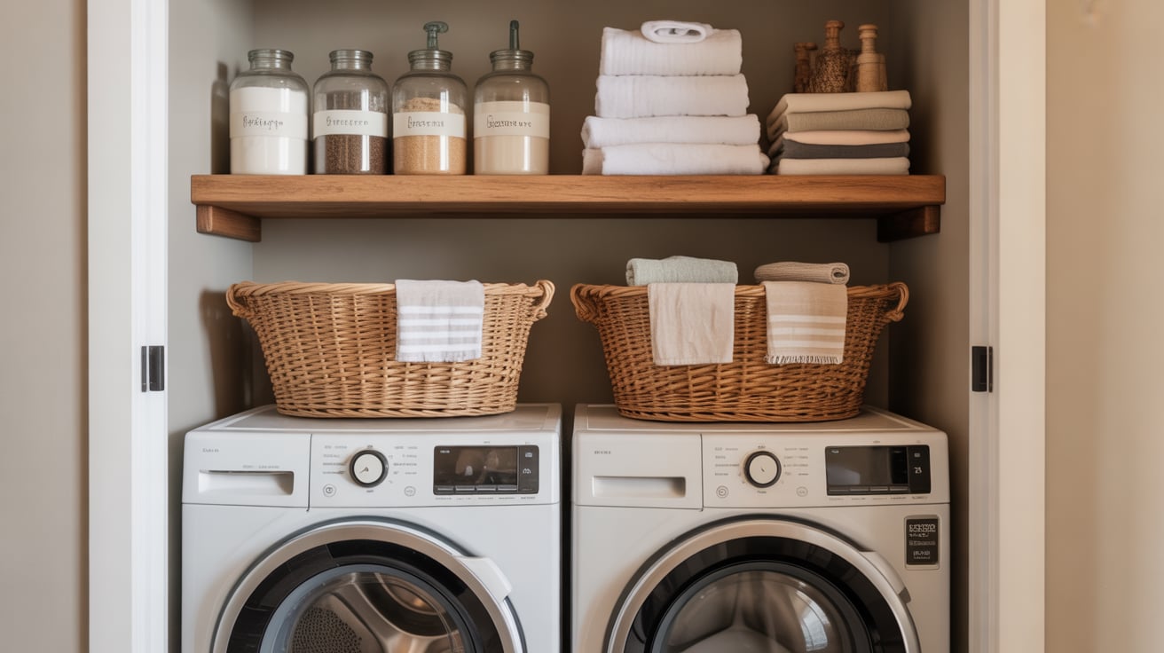 In my first apartment, the washer and dryer sat awkwardly in a hallway closet. Installing two simple floating shelves above them was a game changer — suddenly I had space for jars, towels, and decor!