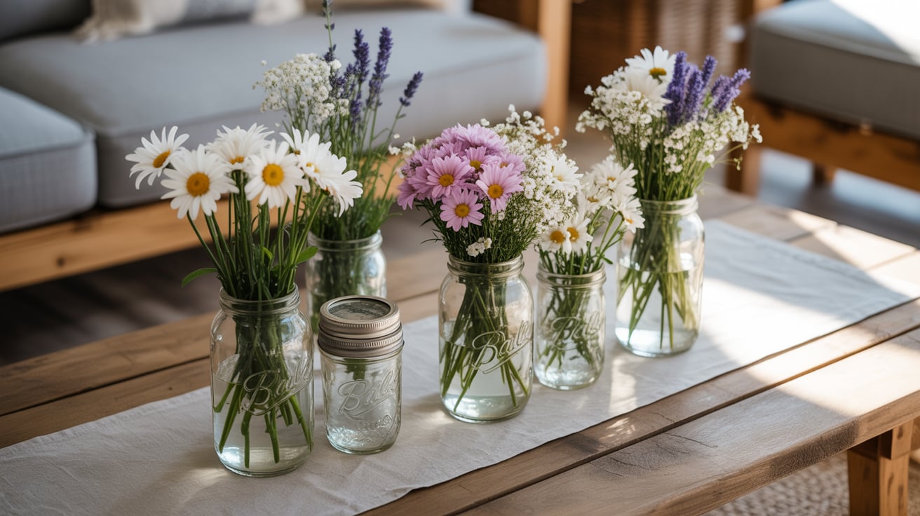 Mason jars are perfect because they are affordable, versatile, and rustic, fitting perfectly into any farmhouse aesthetic. They add color and freshness without taking up too much space. You can switch flowers according to season for a fresh new look every time.