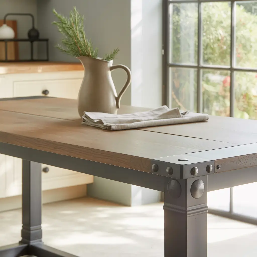 The industrial element typically comes through in the base or hardware. You might see hairpin legs supporting a chunky wood top, or a wood tabletop mounted to a welded steel frame. Some designs incorporate visible bolts, rivets, or metal corner brackets as decorative elements. It’s farmhouse with an urban edge—perfect if straight-up country cottage feels too precious for your taste.