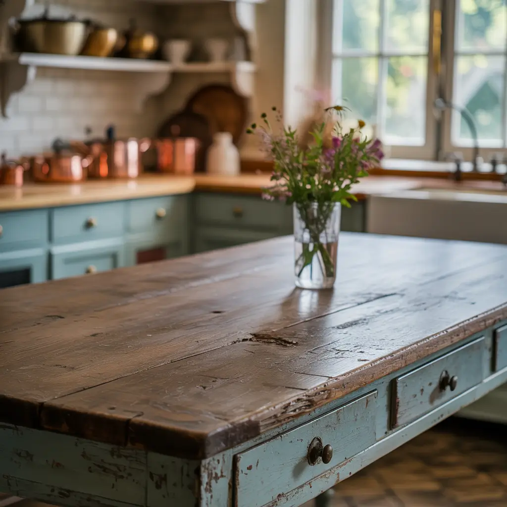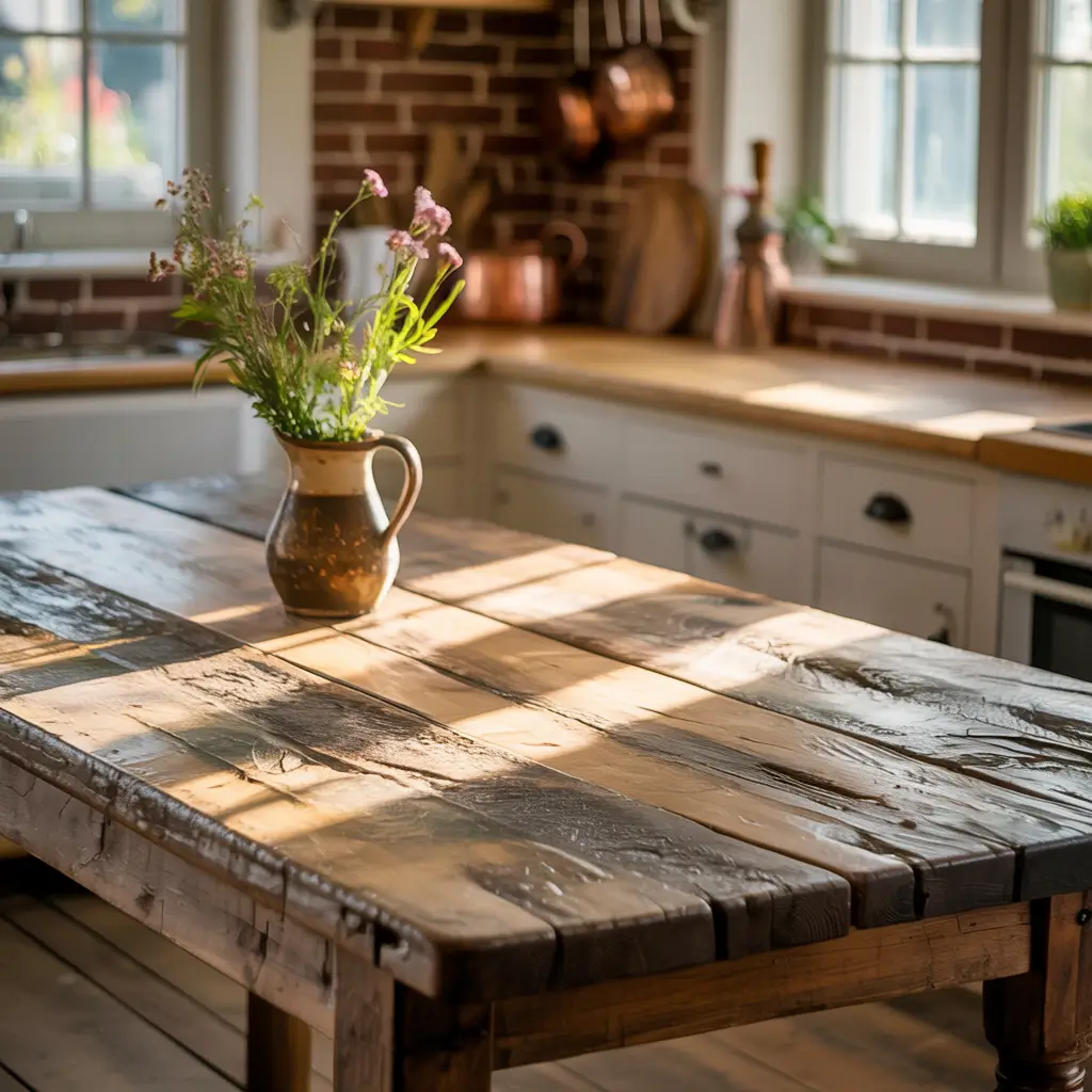 Whitewashed farmhouse tables give you the texture and grain of natural wood while brightening your space with that soft white finish. It’s not stark white paint—whitewashing lets the wood show through, creating depth and visual interest. I love this look for kitchens with darker floors or cabinets because it provides perfect contrast without feeling too matchy-matchy.