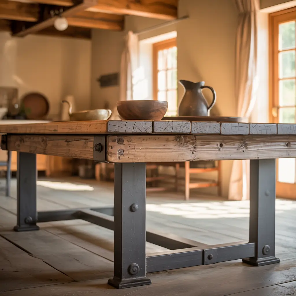 Industrial farmhouse table designs combine rustic wood with metal elements—think iron pipe legs, steel brackets, or mixed metal and wood construction. This hybrid style brings an edgier, more masculine energy to farmhouse design while maintaining that handcrafted, substantial feel. I love this look in kitchens with exposed brick, concrete floors, or stainless appliances.