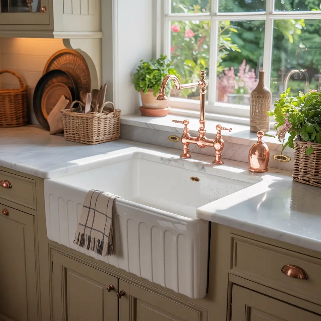 Let’s talk about warmth, shall we? Copper fixtures paired with a farmhouse sink create this incredible warmth that’s impossible to achieve with standard chrome or stainless steel.