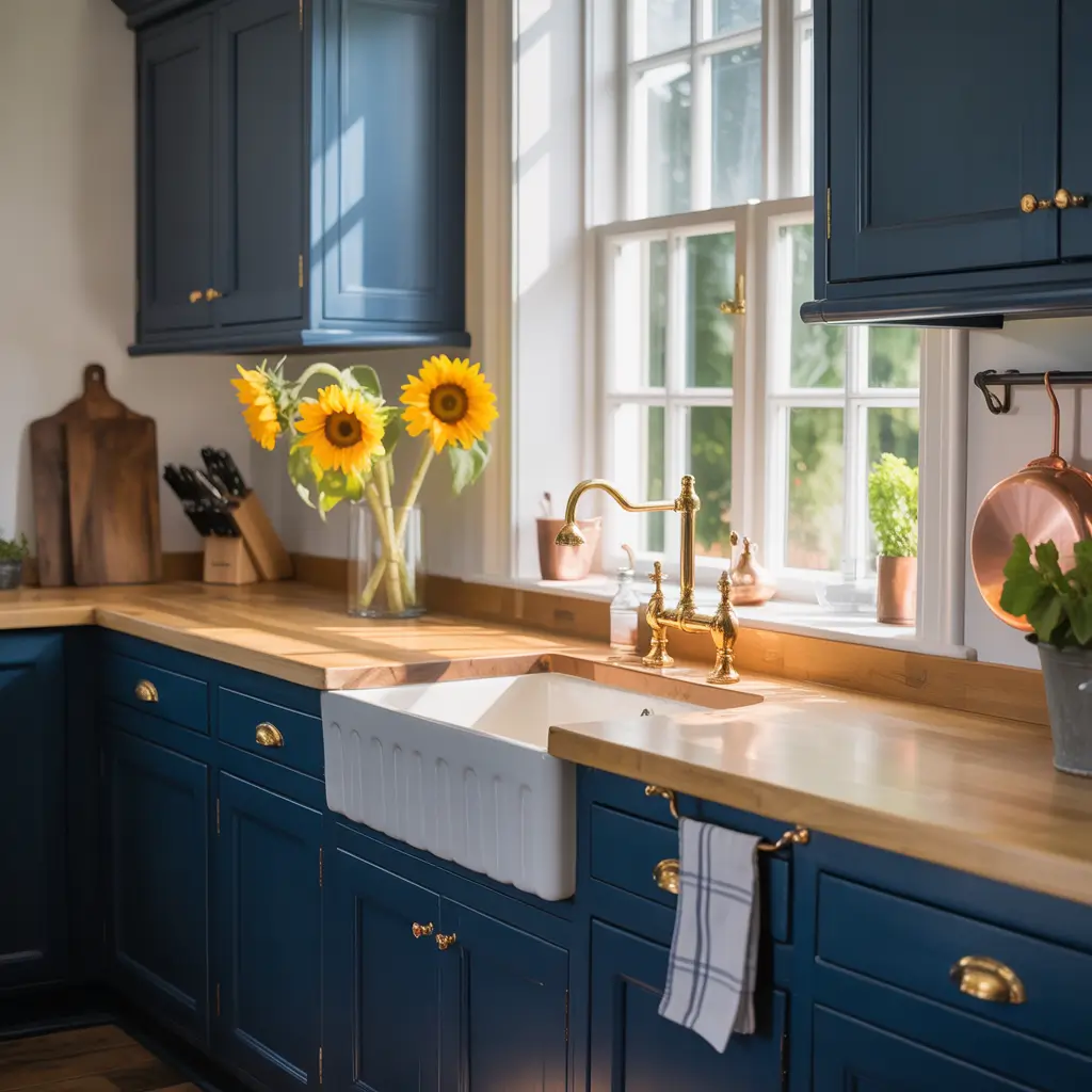 The farmhouse sink can match your bold choice (like a navy blue sink with navy cabinets) or provide contrast (white sink with navy cabinets). Both approaches work—it just depends on how committed you are to the bold look.