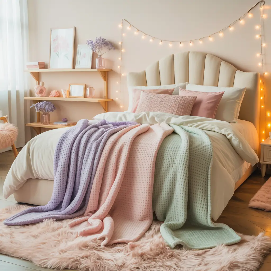 - Multiple throw blankets in different pastel shades
