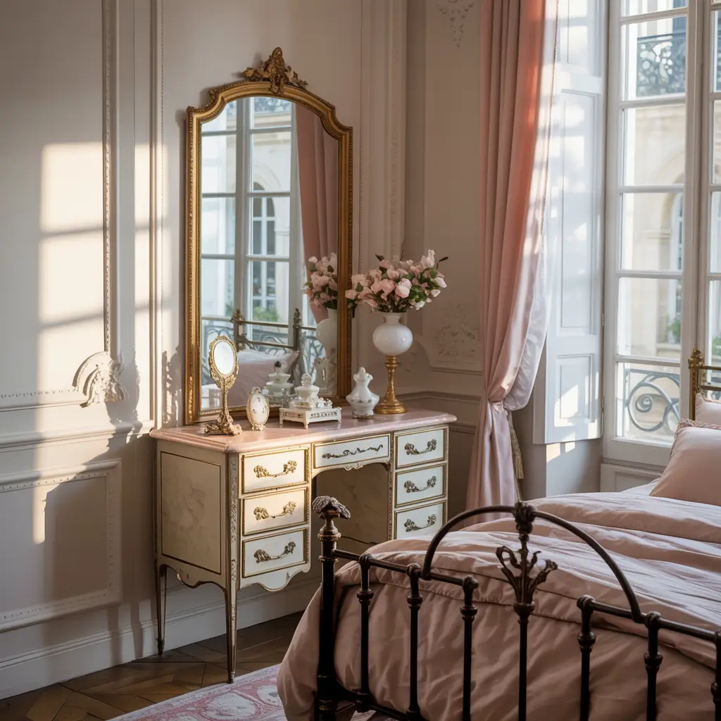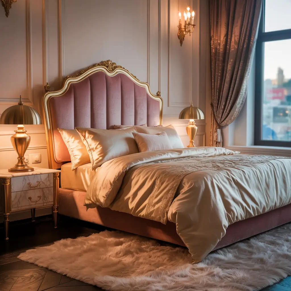 Picture ornate mirrors with gilded frames, a vintage-style tufted headboard in blush velvet, crisp white linens with subtle pink accents, and maybe a small chandelier that catches the morning light. It’s fancy but lived-in, elegant but comfortable.