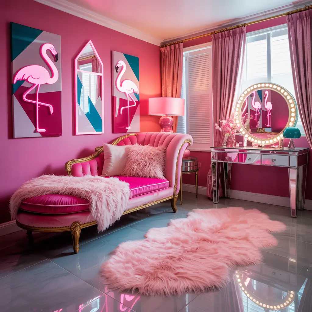 - Bright pink walls or accent wall in that signature Barbie shade