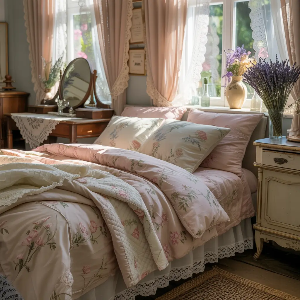 - Floral quilts or bedspreads with pink flowers