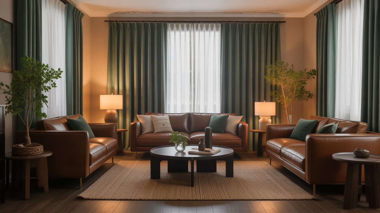 You can use forest green curtains with leather sofas, wooden coffee tables, and textured rugs for a rich, cozy environment.