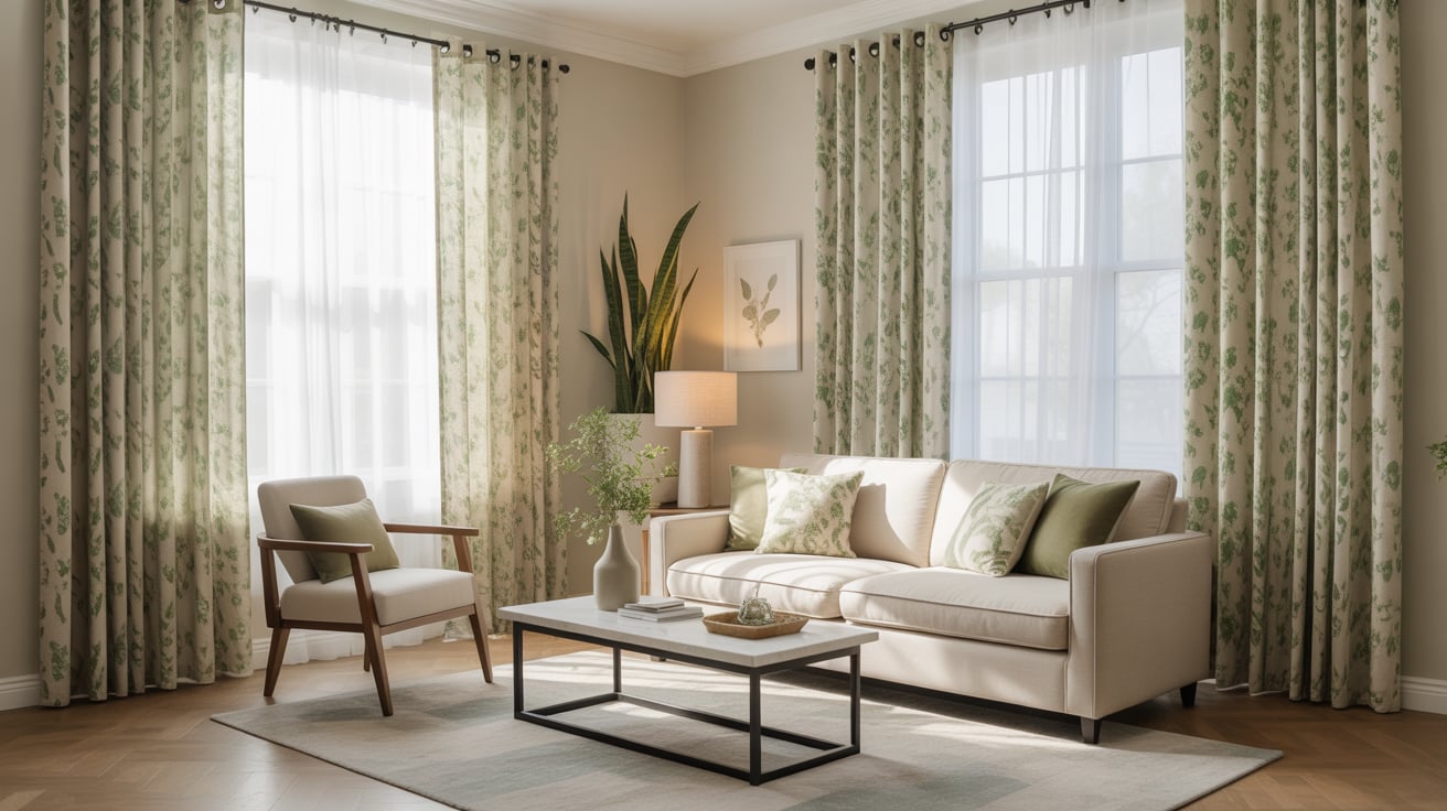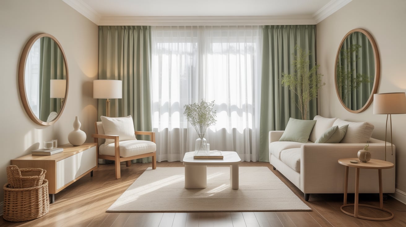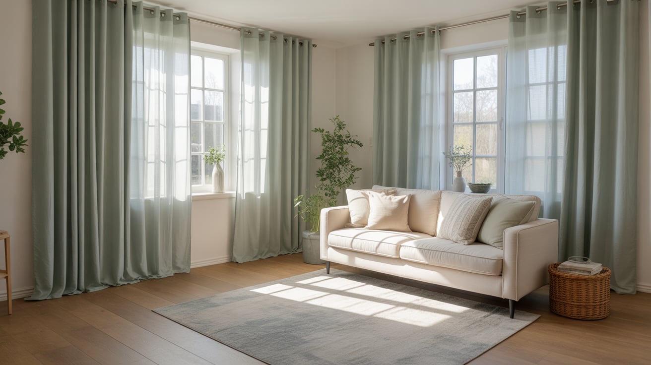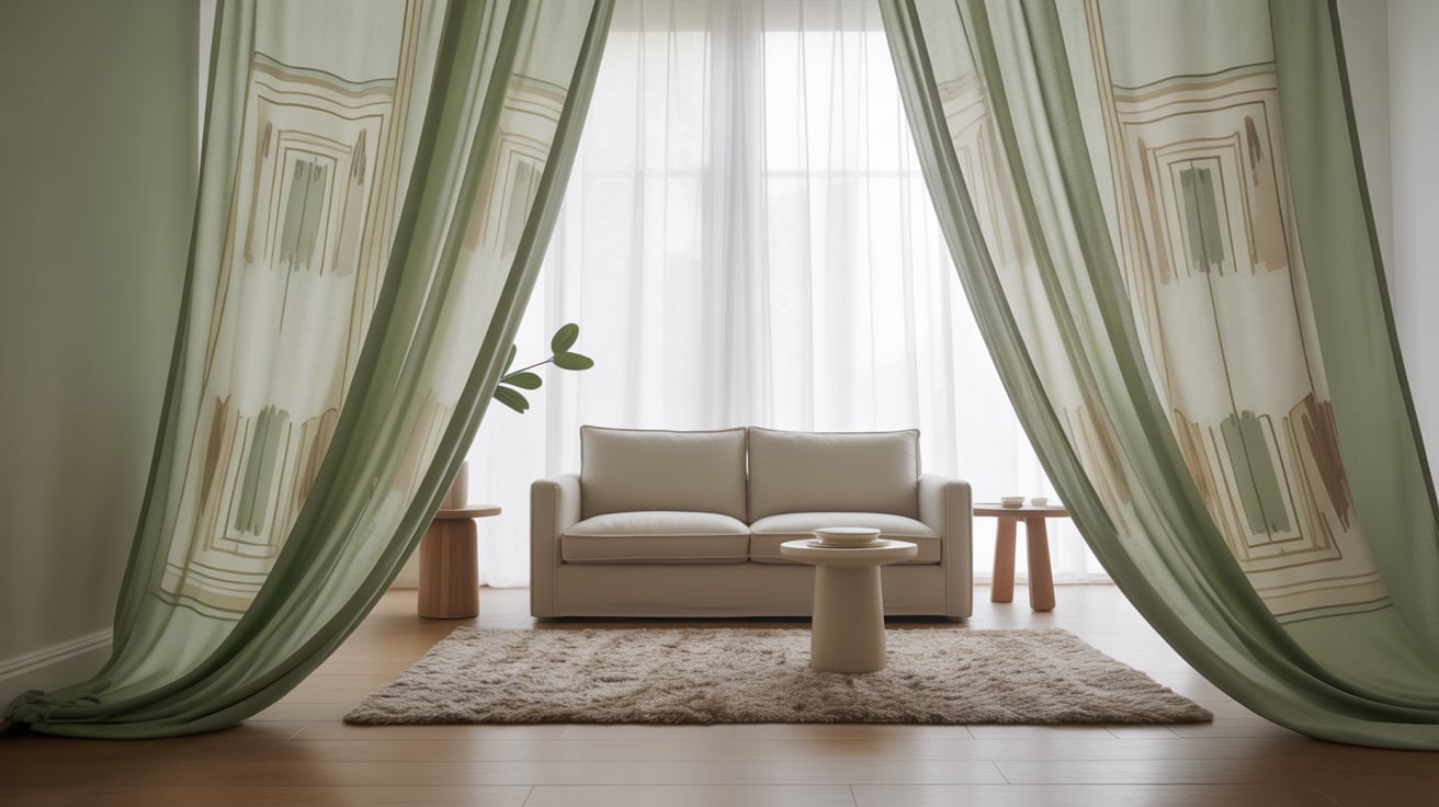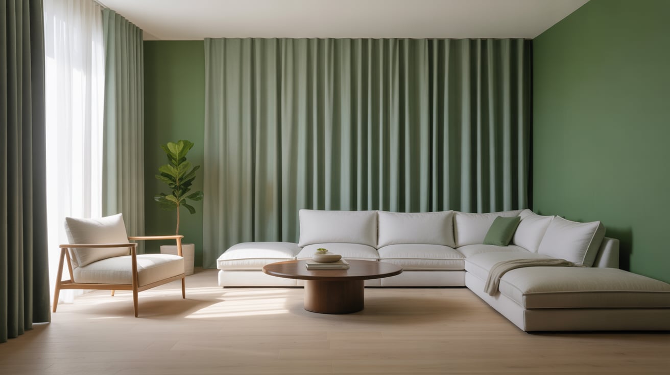 You can apply this by pairing sage curtains with beige or cream sofas, wooden accents, and soft rugs to create a balanced, serene look.