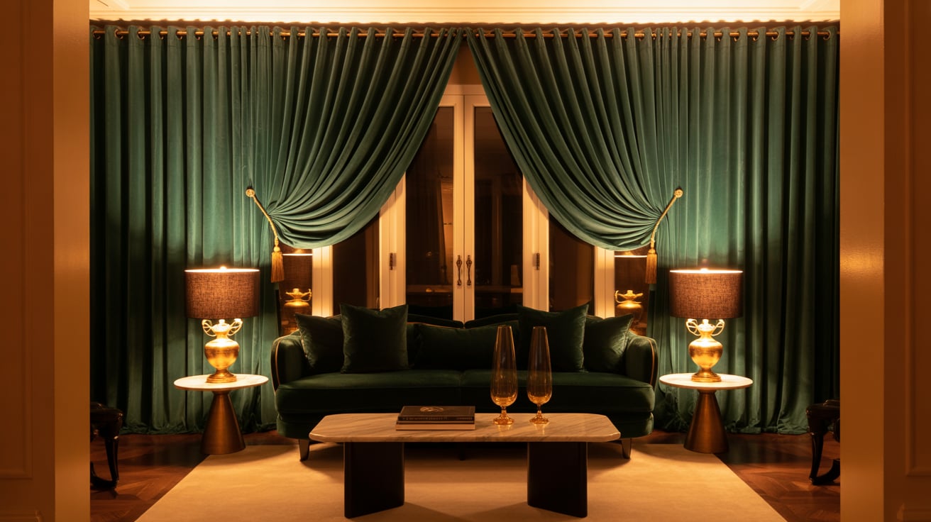 Try pairing emerald curtains with dark wood furniture, gold accessories, and velvet cushions for a luxurious feel.
