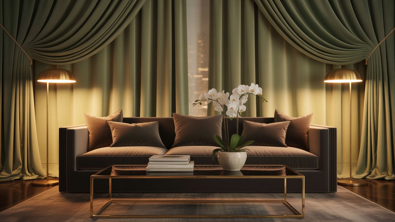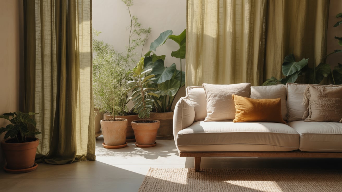 Apply this by mixing olive curtains with indoor plants, neutral furniture, and soft textured rugs for a balanced, earthy vibe.