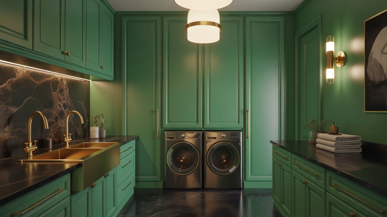 Emerald green adds sophistication and depth, especially when balanced with gold or brass accents. It’s a rich, elegant choice that instantly elevates your laundry space.
