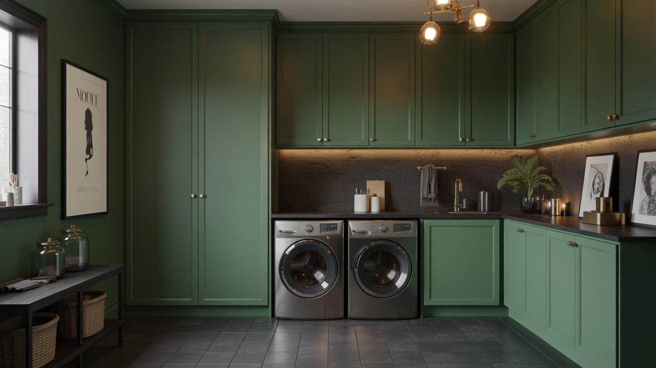 When I wanted something bold, I went for dark forest green walls with black hardware — and it turned out stunning. It made my laundry space feel moody, modern, and luxurious.