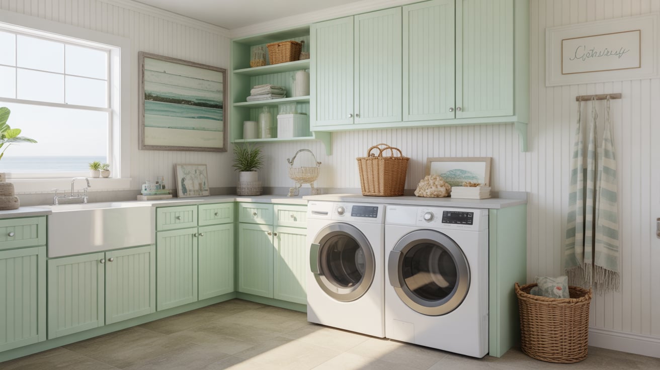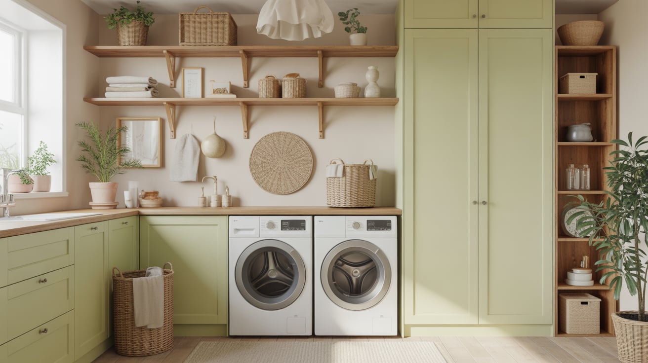 This look works because sage is soothing, timeless, and pairs beautifully with whites, grays, or natural woods. It gives your laundry space a light, airy charm without feeling too bold.
