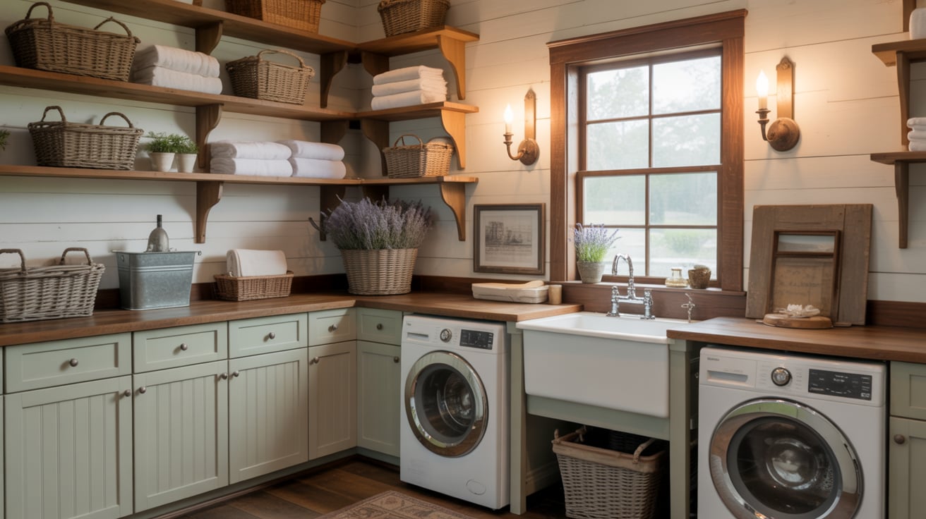 This look combines comfort with countryside nostalgia. It’s inviting and warm, making laundry days feel less like chores.