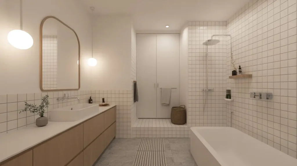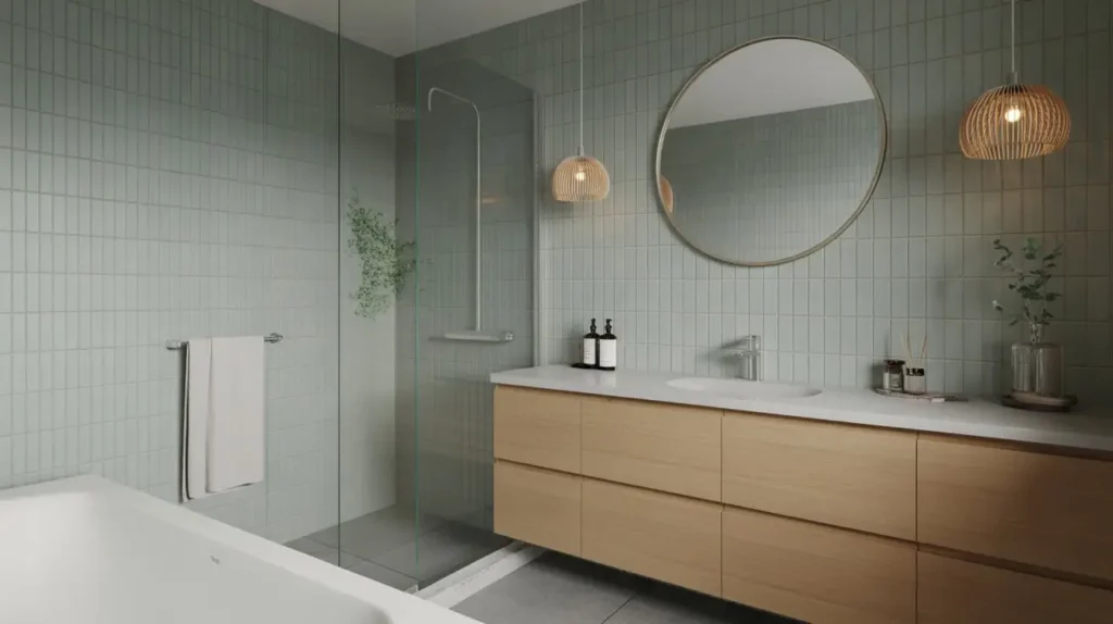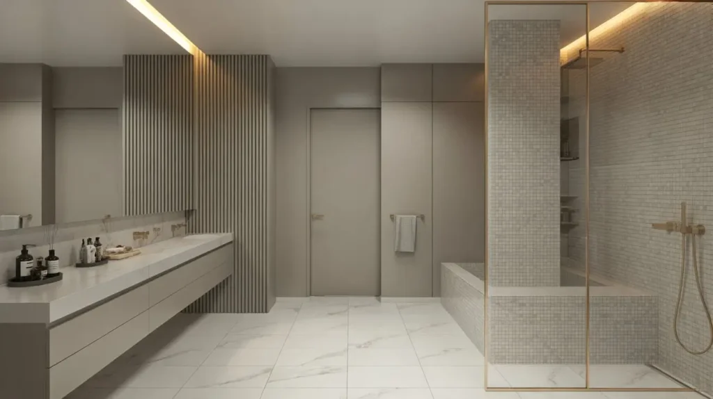 Not all greys are created equal. Warm grey tiles—those with beige or brown undertones—create entirely different atmospheres than cool greys with blue undertones. Pair warm greys with soft, layered lighting, and you’ve created a bathroom that feels cozy and inviting.