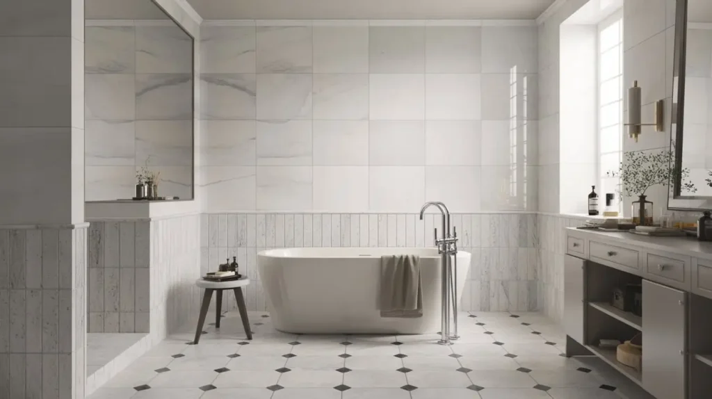 - Marble-look porcelain tiles give you the aesthetic without the maintenance headaches (game-changer, honestly)