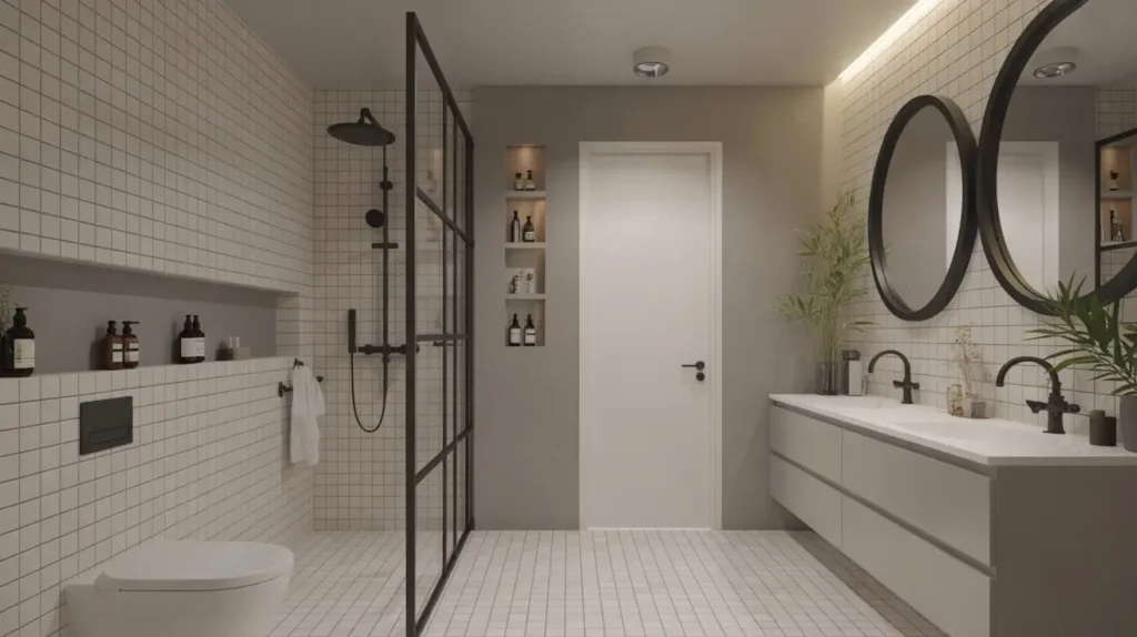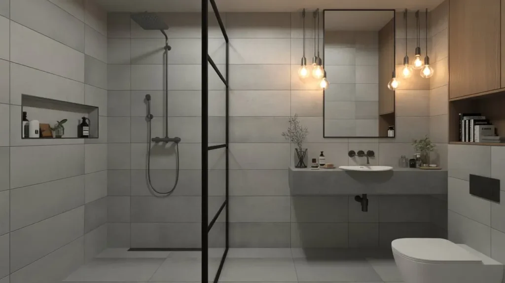 I visited a loft apartment last year with a bathroom that used large-format concrete-look grey tiles on both walls and floors. The owner paired them with matte black fixtures and exposed bulb lighting. The whole vibe screamed “Brooklyn industrial,” and I was absolutely here for it.