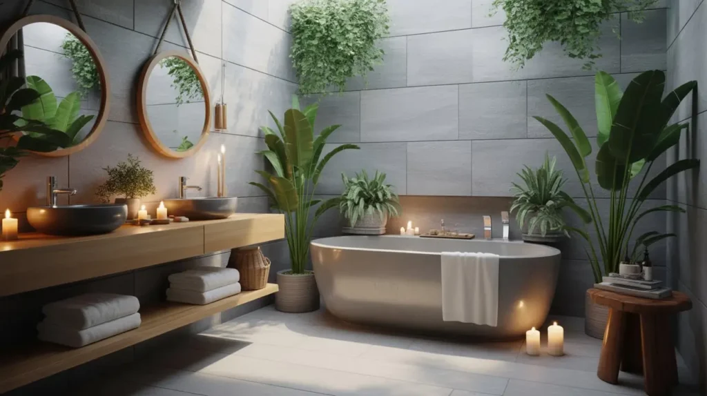 - Natural materials mixed with grey tiles—think wood, stone, bamboo