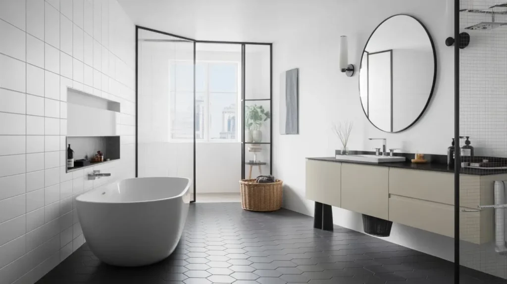 I’ve seen people use large grey hexagon tiles on the floor while keeping walls simple with white subway tiles. The floor becomes a statement element while the walls provide a calm backdrop. Smart approach, honestly.