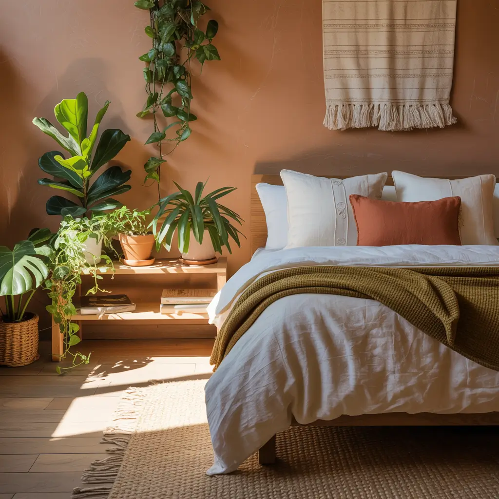 The earthy style is all about connecting with nature, even indoors. I painted one wall in a gorgeous terracotta shade and kept the other walls neutral. Then I added tons of plants—pothos, snake plants, a rubber tree in the corner. The room literally feels alive and breathing.