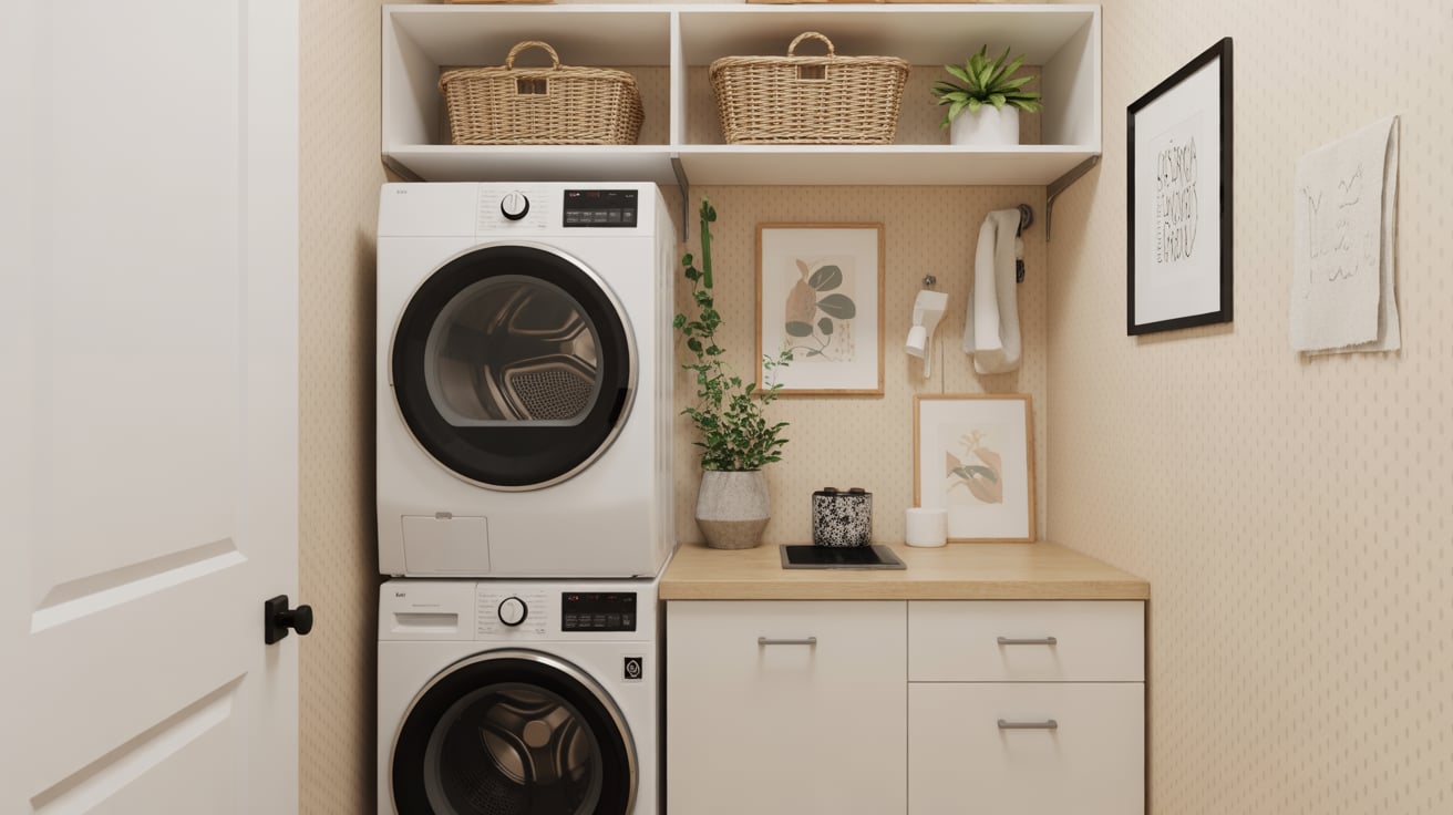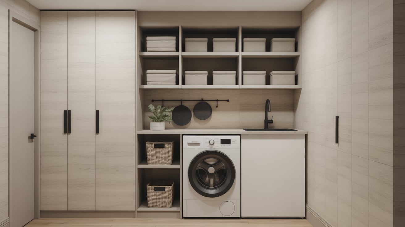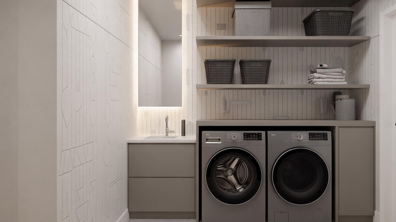 Soft tones make your laundry area feel clean and peaceful. Perfect for smaller spaces or homes with limited natural light.