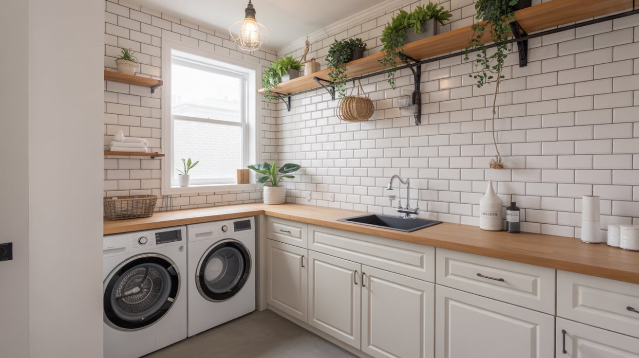 When I upgraded my laundry setup, I went bold with geometric wallpaper — subtle grey hexagons that gave my walls instant personality. It looked designer-made without the price tag.