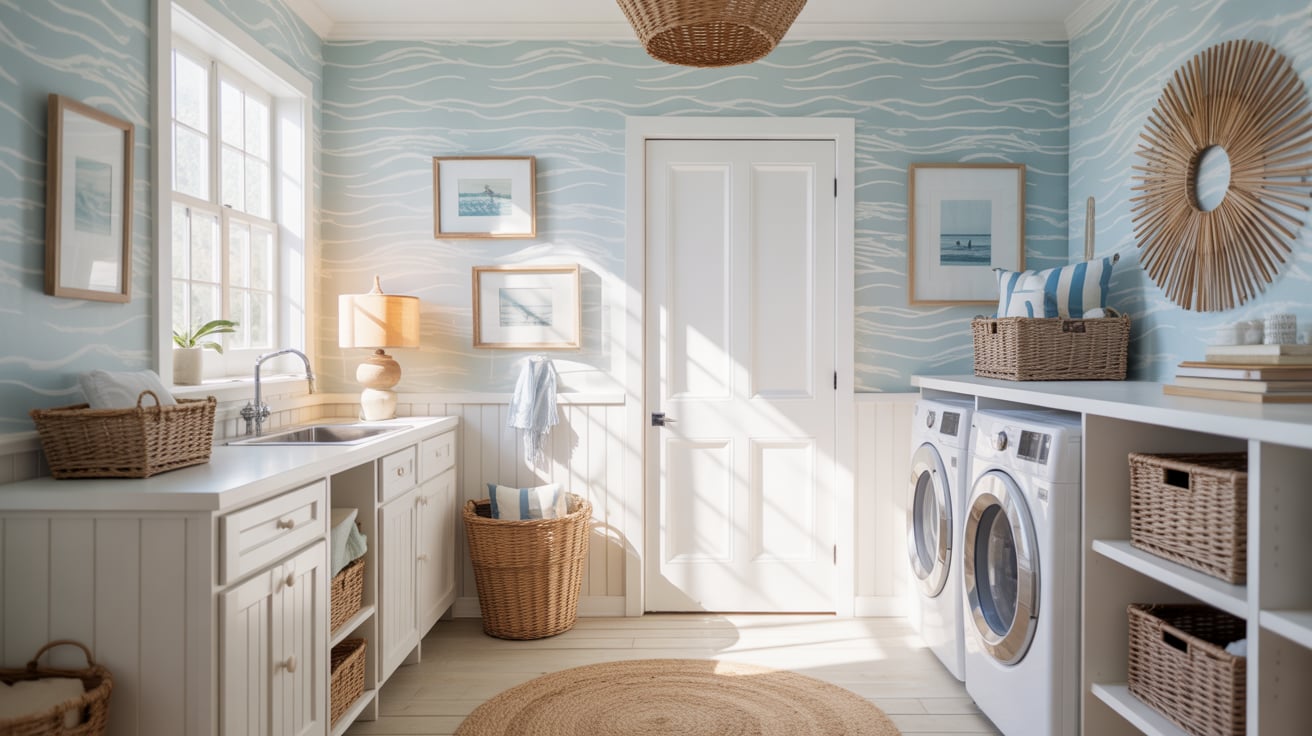 I once tried a blue-and-white striped wallpaper in my laundry nook, and it instantly gave it a clean, coastal vibe. It made my tiny space look taller and brighter — like magic in minutes.