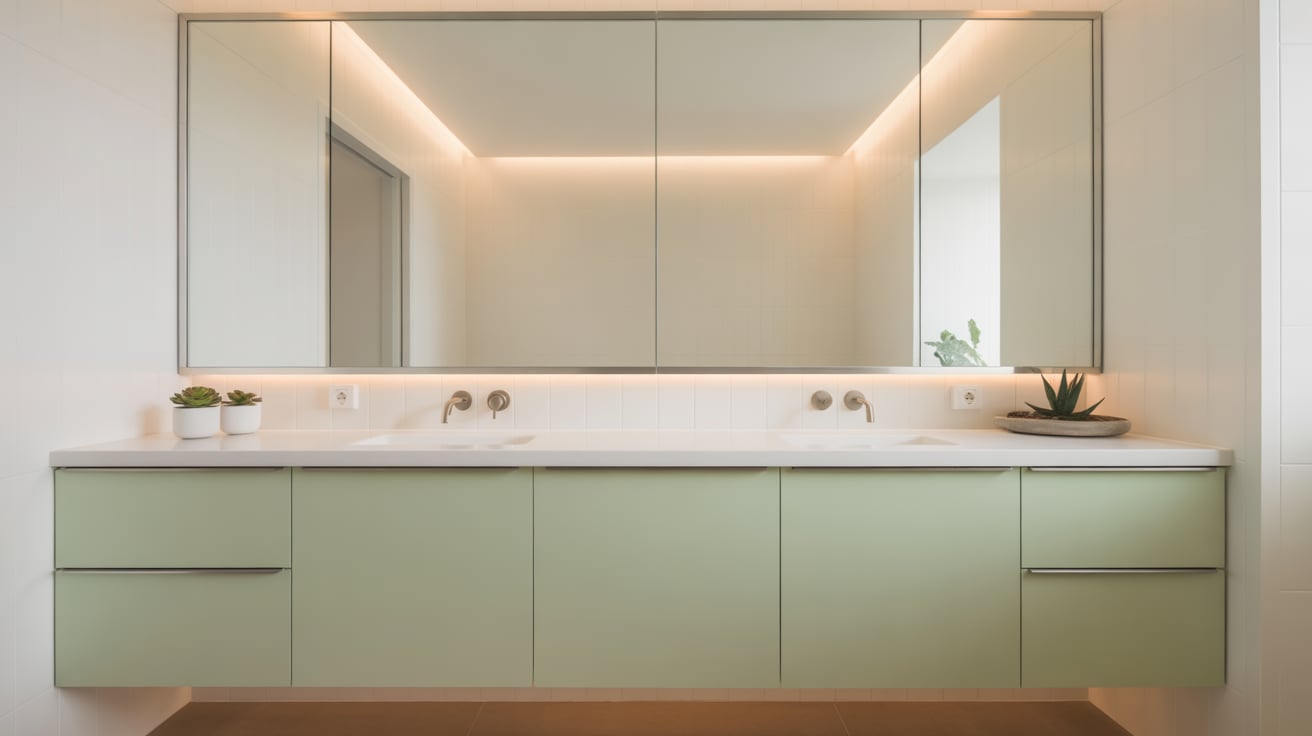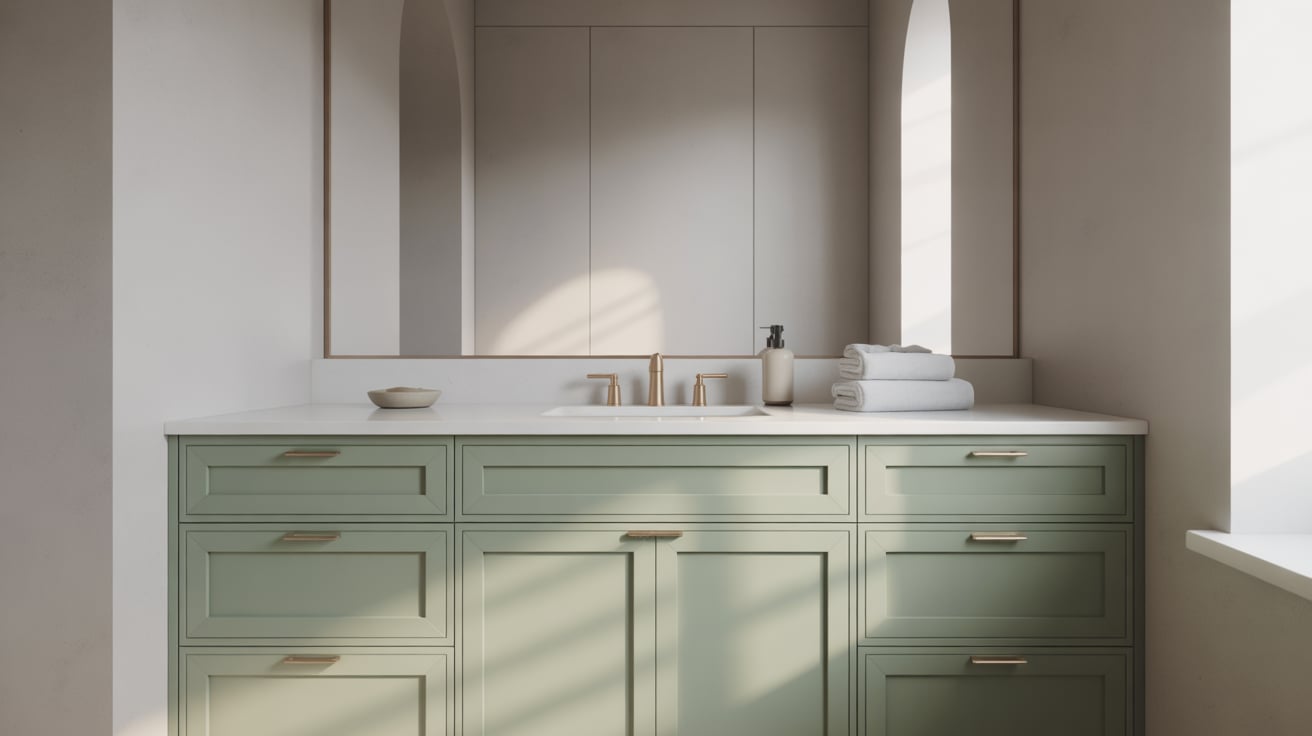 Floating cabinets work because they create storage without blocking floor space, making small bathrooms feel open. The soft green adds a fresh, airy look.