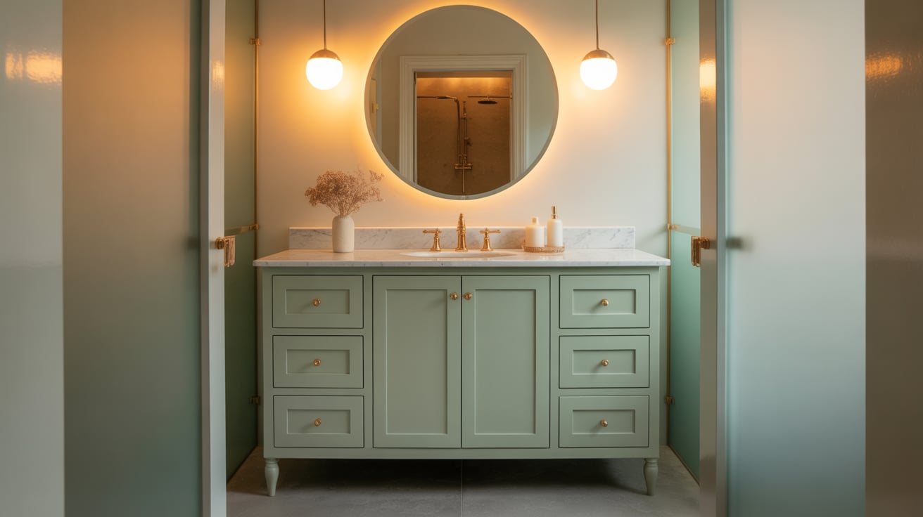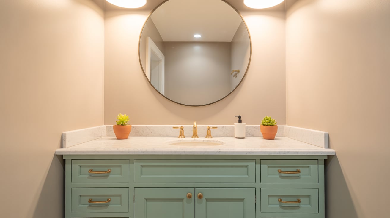I installed a mint green vanity and paired it with a large round mirror. The combination instantly brightened the room and made it feel stylish yet approachable.