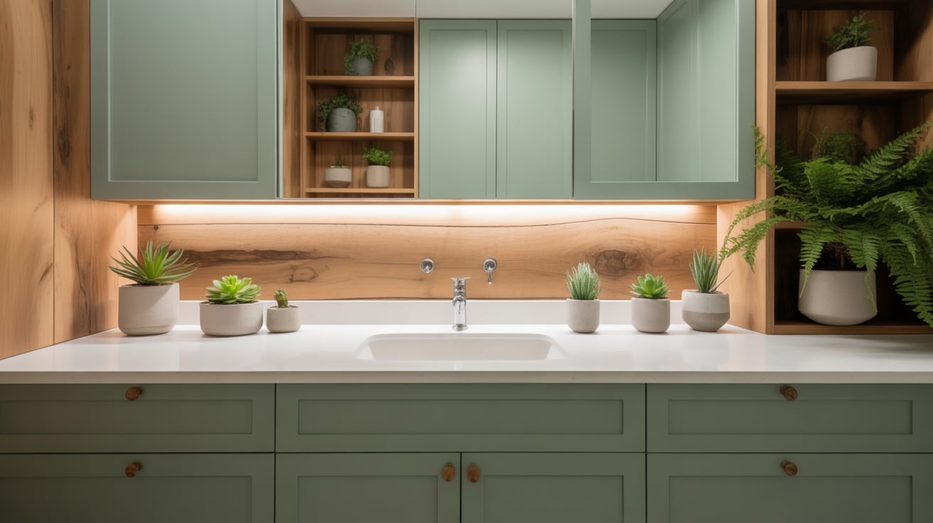 I added light green cabinets paired with natural wood shelves in my bathroom. The warmth of the wood balanced the cool green, creating a cozy, inviting space.