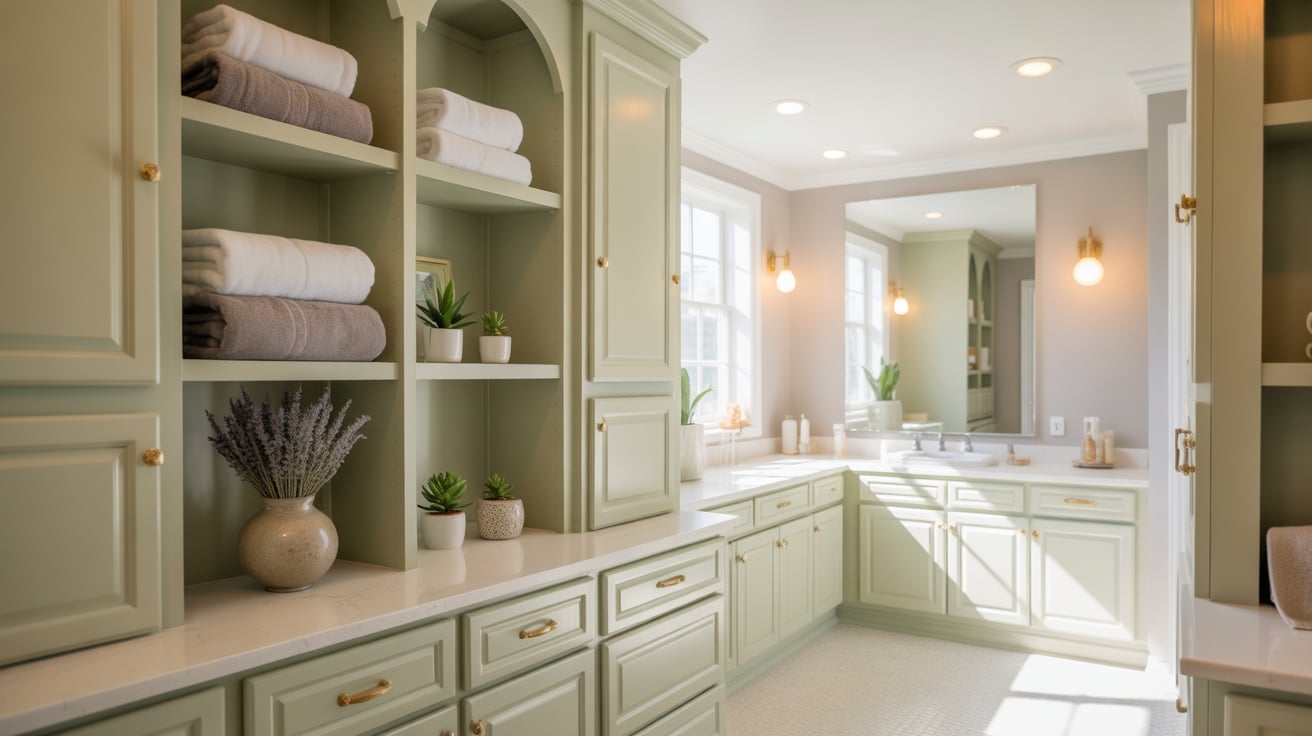 I combined mint green cabinets with open shelving displaying towels and plants. The bathroom felt airy, organized, and welcoming.