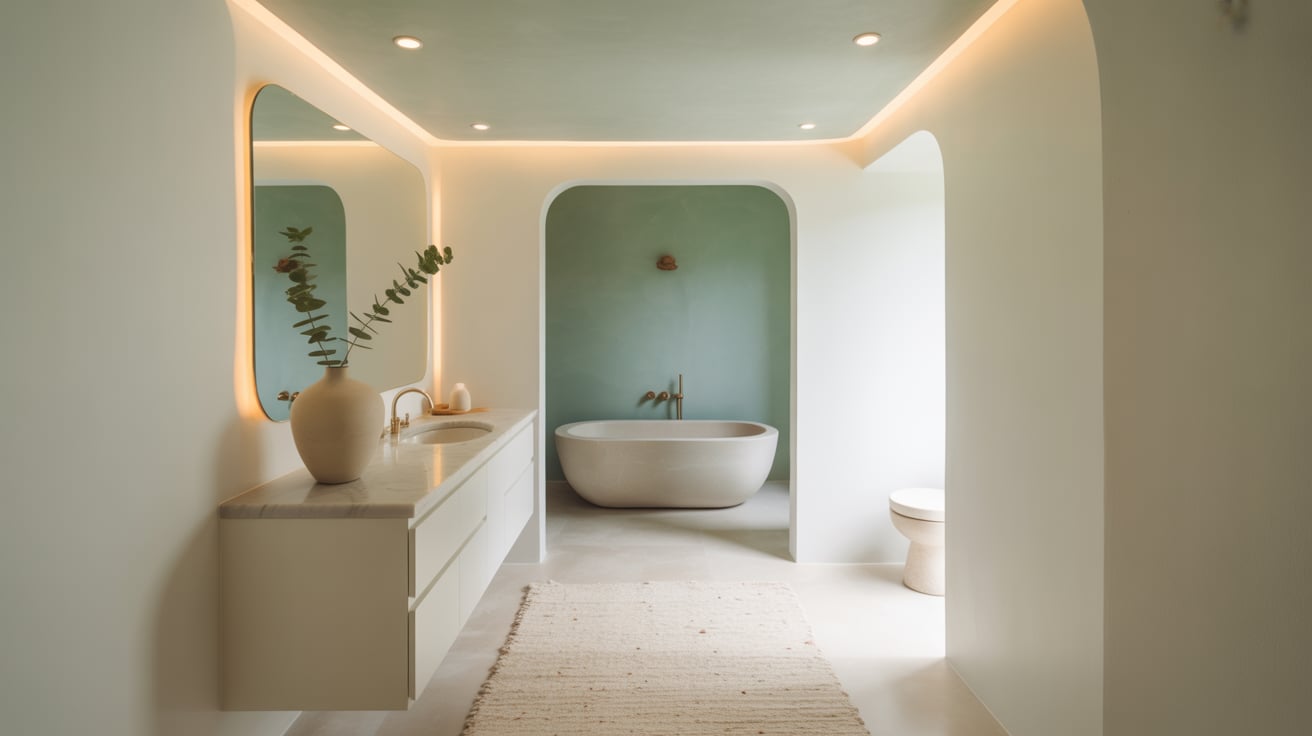 This design works because combining green with natural materials adds depth and warmth. It’s perfect for a spa-like atmosphere.