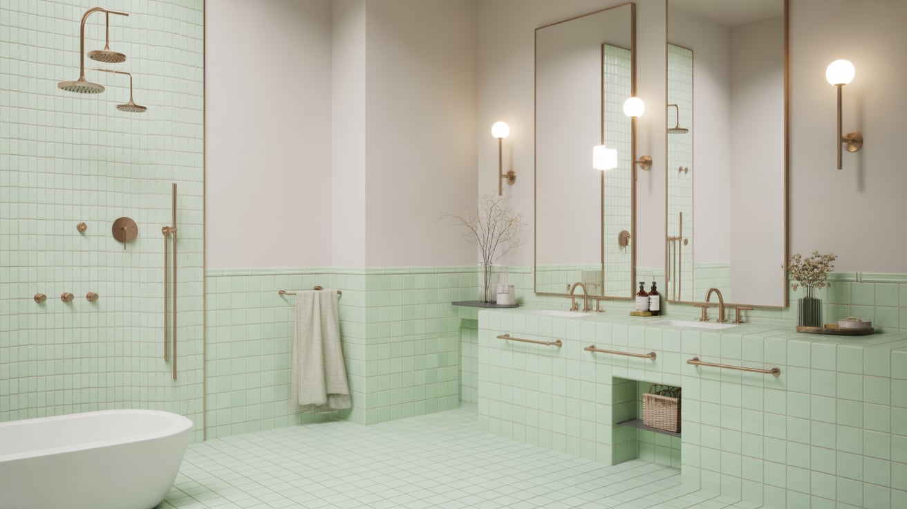 I renovated a bathroom with light green tiles and brushed brass faucets. It felt modern, elegant, and luxurious all at once.