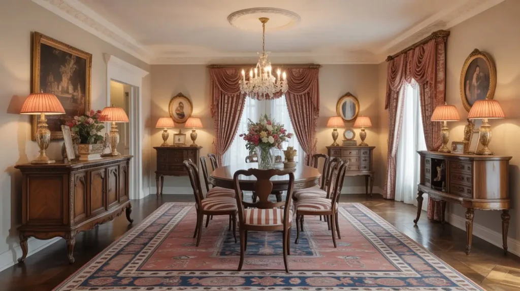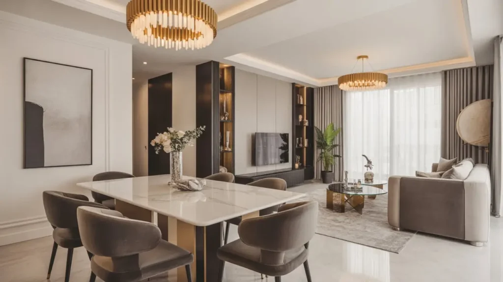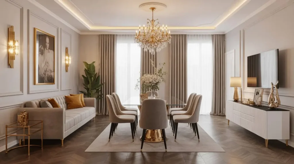 The trick with glam? Balance. Too much shine and you’re squinting through dinner. Too many metallics and you’ve created a disco ball, not a dining area.