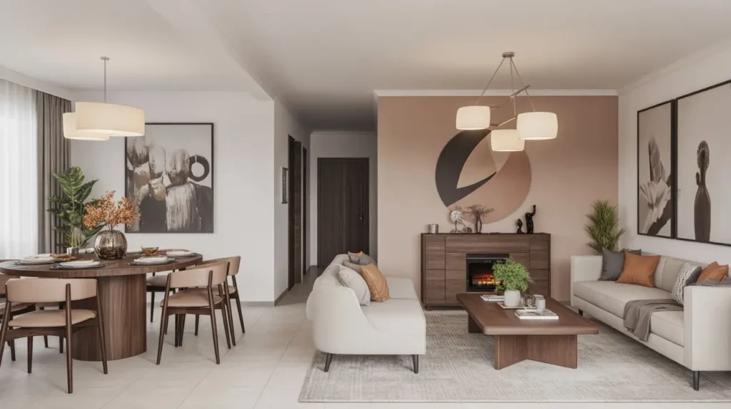 Embrace wabi-sabi principles—find beauty in imperfection and natural materials. Your dining table might show wood grain variations; that’s a feature, not a flaw. Add warmth through natural textiles like linen and cotton in neutral tones. The space should feel meditative and intentional, like each element contributes to the overall calm. No visual screaming here—just peaceful, warm harmony.