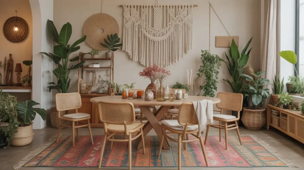 - Mix textures aggressively: macramé, rattan, woven textiles, leather, plants